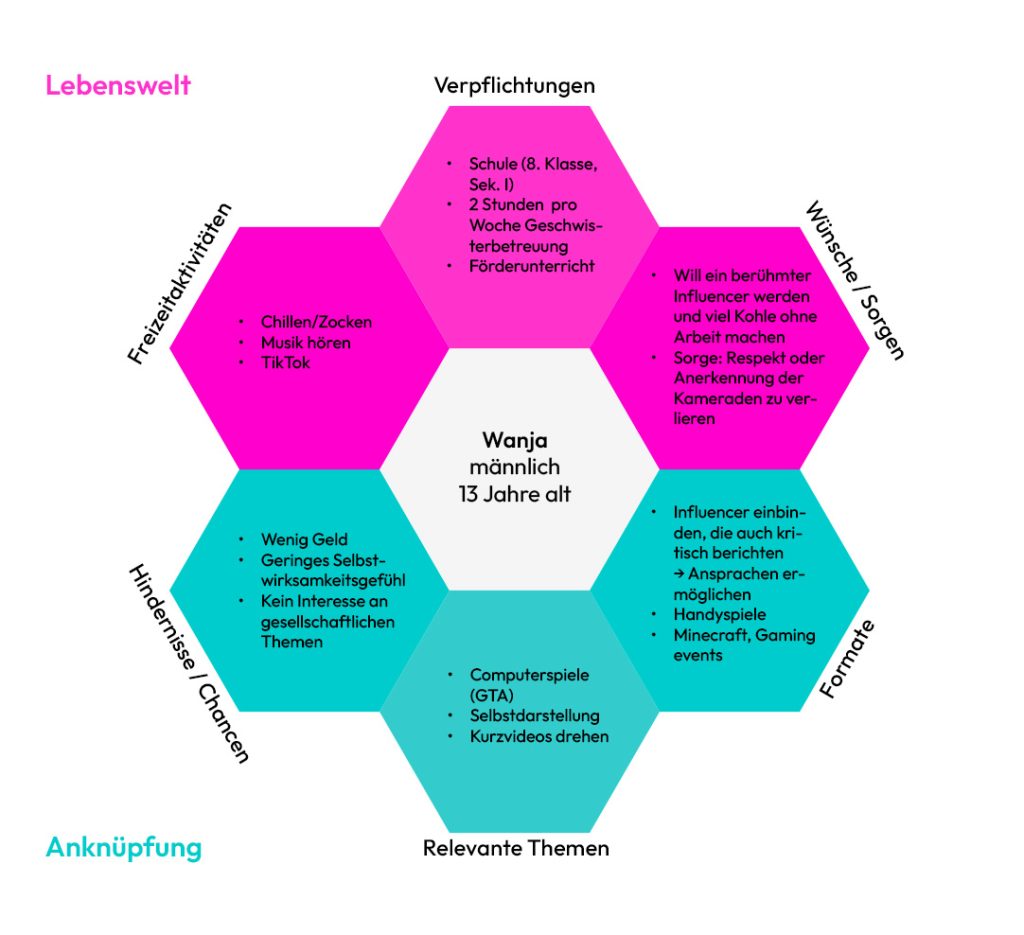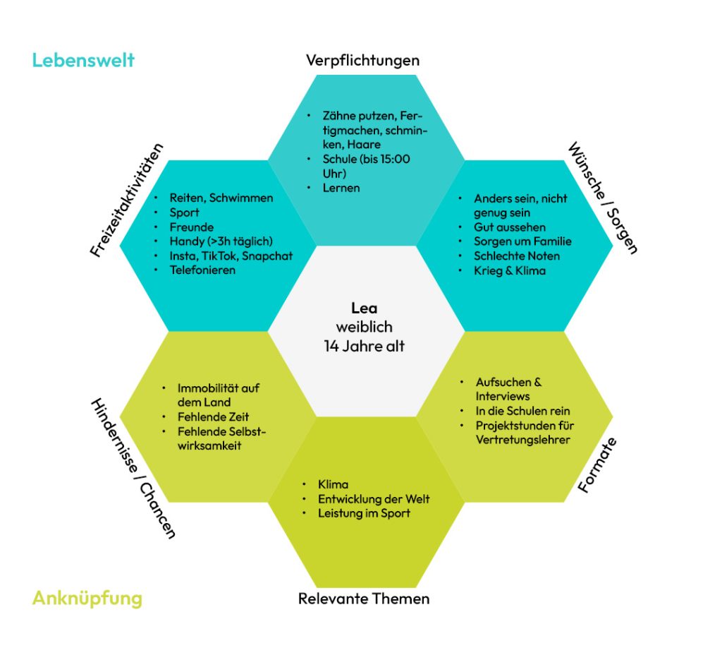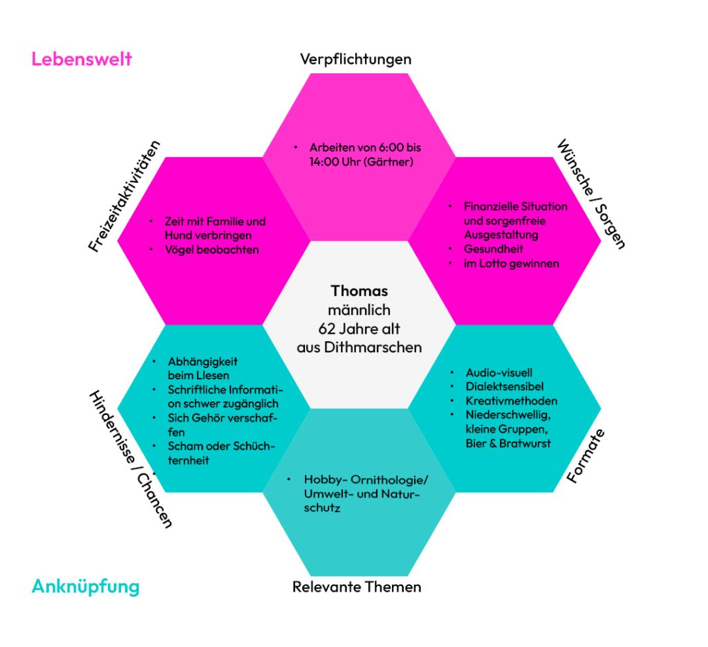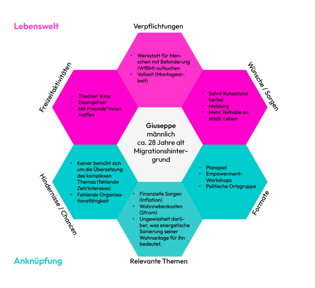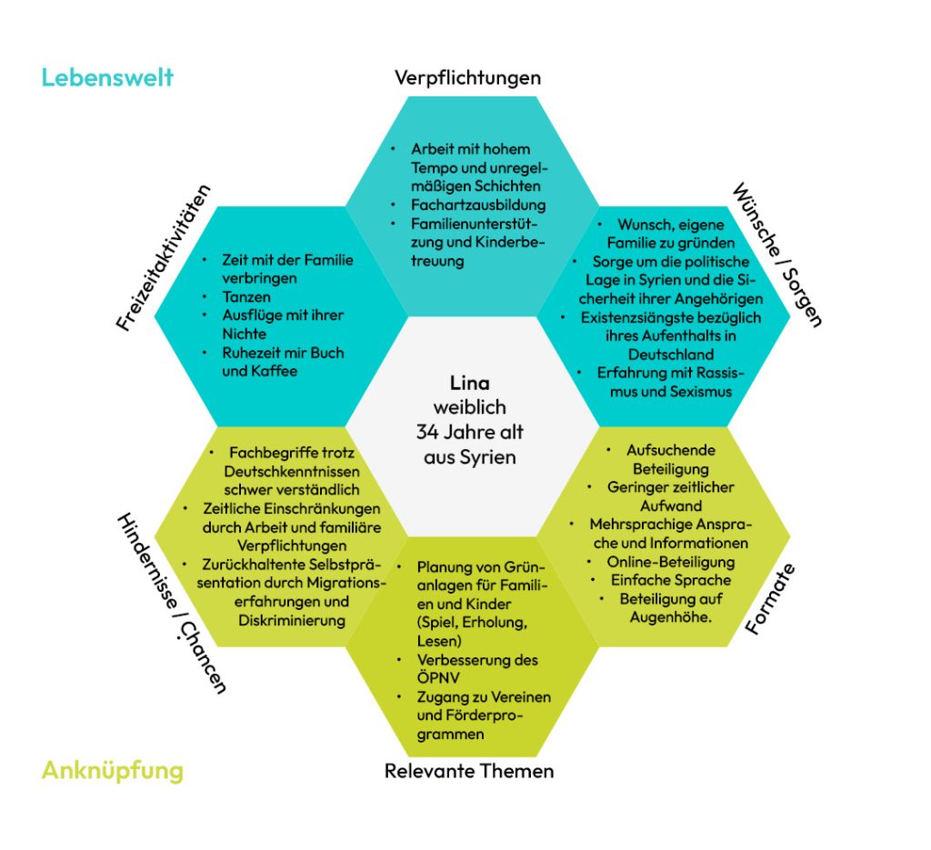 Die Persona-Methode kommt aus dem „Design Thinking“. Der Ansatz lässt sich auch auf Beteiligungsprozesse übertragen. Mit der Persona-Methode wird eine fiktive Person entwickelt – mit Details zu ihrem Alltag, ihren Wünschen, Sorgen und Hoffnungen. Die Personamethode hat Grenzen und ersetzt nicht, Menschen aus der jeweiligen Zielgruppe zu Wort kommen zu lassen. Sie kann aber helfen, eine passende Ansprache für diese zu finden.