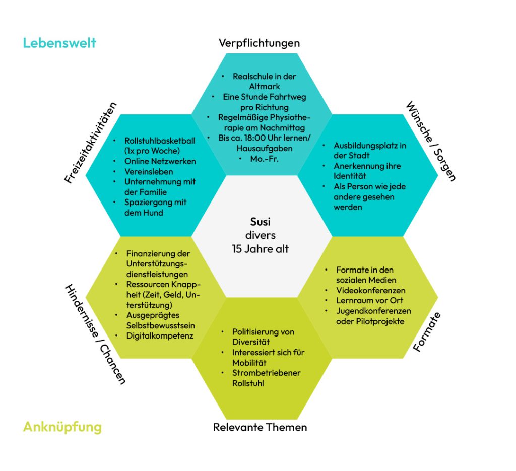 Zusätzlich gibt es natürlich nicht die eine migrantische Perspektive, die eine junge Perspektive oder die eine Perspektive von Menschen mit Behinderungen, sondern eine große Heterogenität. Mit mindestens zwei Personas pro „Gruppe“ soll zumindest etwas Vielfalt innerhalb der jeweiligen Gruppen abgedeckt werden.